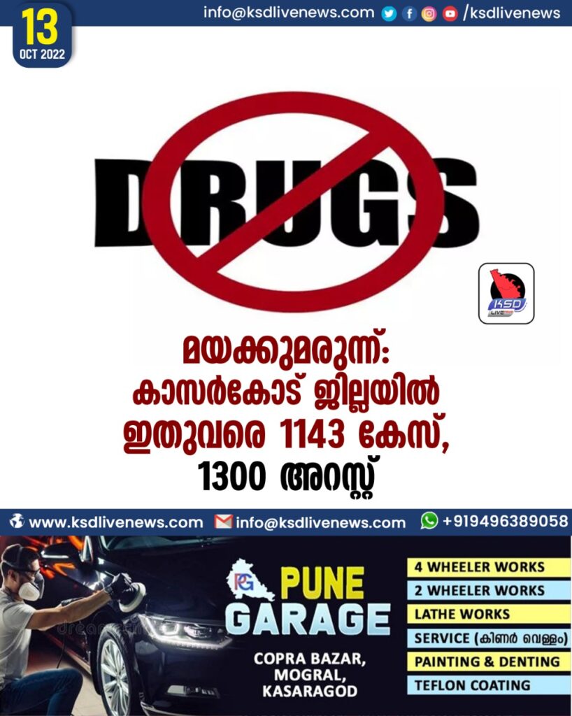 മയക്കുമരുന്ന്: കാസർകോട് ജില്ലയിൽ ഇതുവരെ 1143 കേസ്, 1300 അറസ്റ്റ്