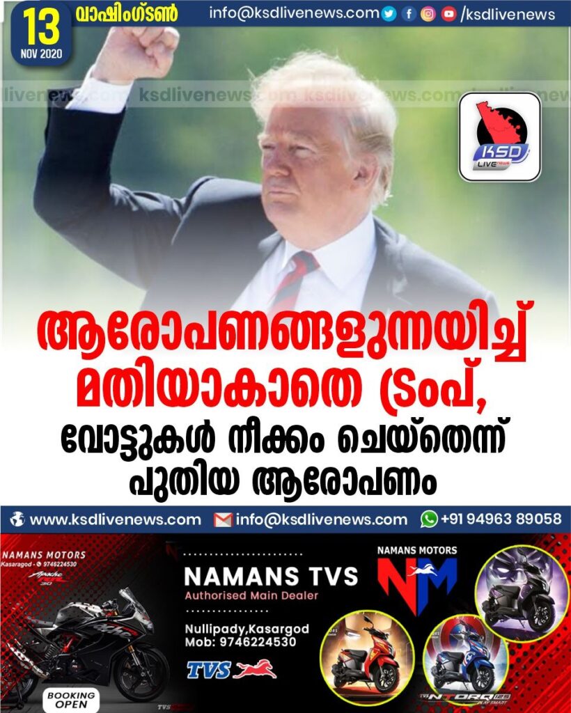 ആരോപണങ്ങളുന്നയിച്ച് മതിയാകാതെ ട്രംപ്, വോട്ടുകള് നീക്കം ചെയ്തെന്ന് പുതിയ ആരോപണം