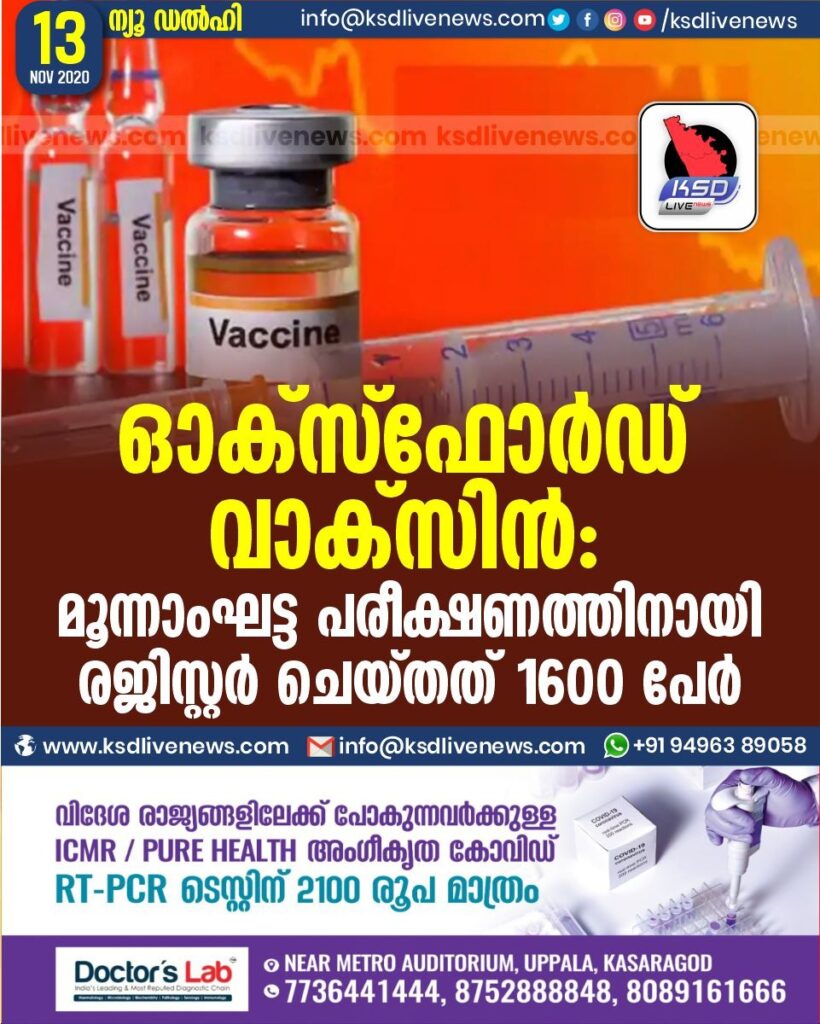 ഓക്സ്ഫോർഡ് വാക്സിൻ : മൂന്നാംഘട്ട പരീക്ഷണത്തിനായി രജിസ്റ്റർ ചെയ്തത് 1600 പേർ