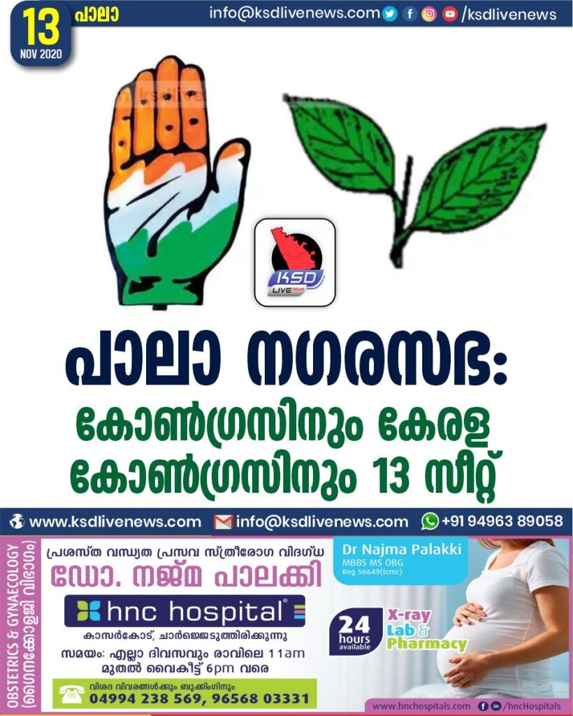 പാലാ നഗരസഭ : കോൺഗ്രസിനും കേരള കോൺഗ്രസിനും 13 സീറ്റ്