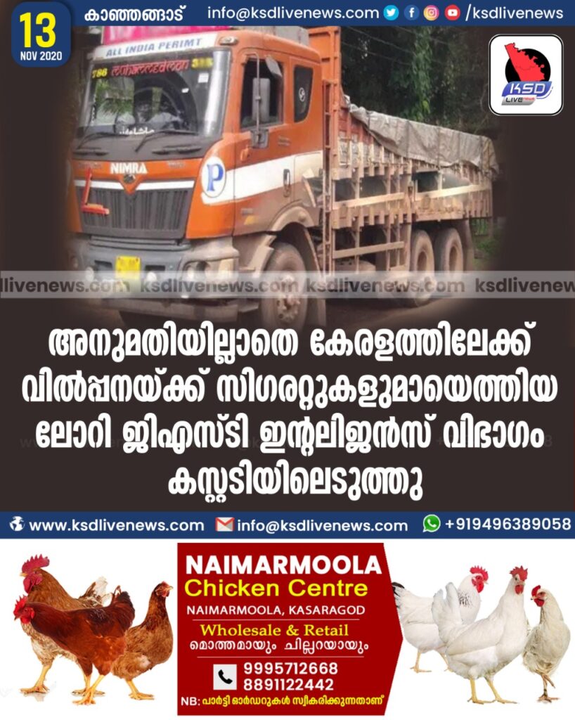 അനുമതിയില്ലാതെ കേരളത്തിലേക്ക് വില്‍പ്പനയ്ക്ക് സിഗരറ്റുകളുമായെത്തിയ ലോറി ജിഎസ്ടി ഇന്റലിജൻസ് വിഭാഗം കസ്റ്റടിയിലെടുത്തു