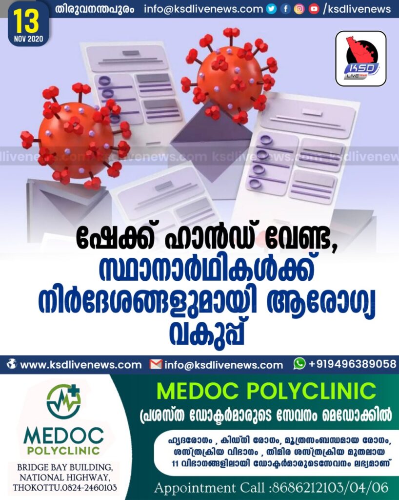 ഷേക്ക് ഹാൻഡ് വേണ്ട , സ്ഥാനാർഥികൾക്ക് നിർദേശങ്ങളുമായി ആരോഗ്യ വകുപ്പ്