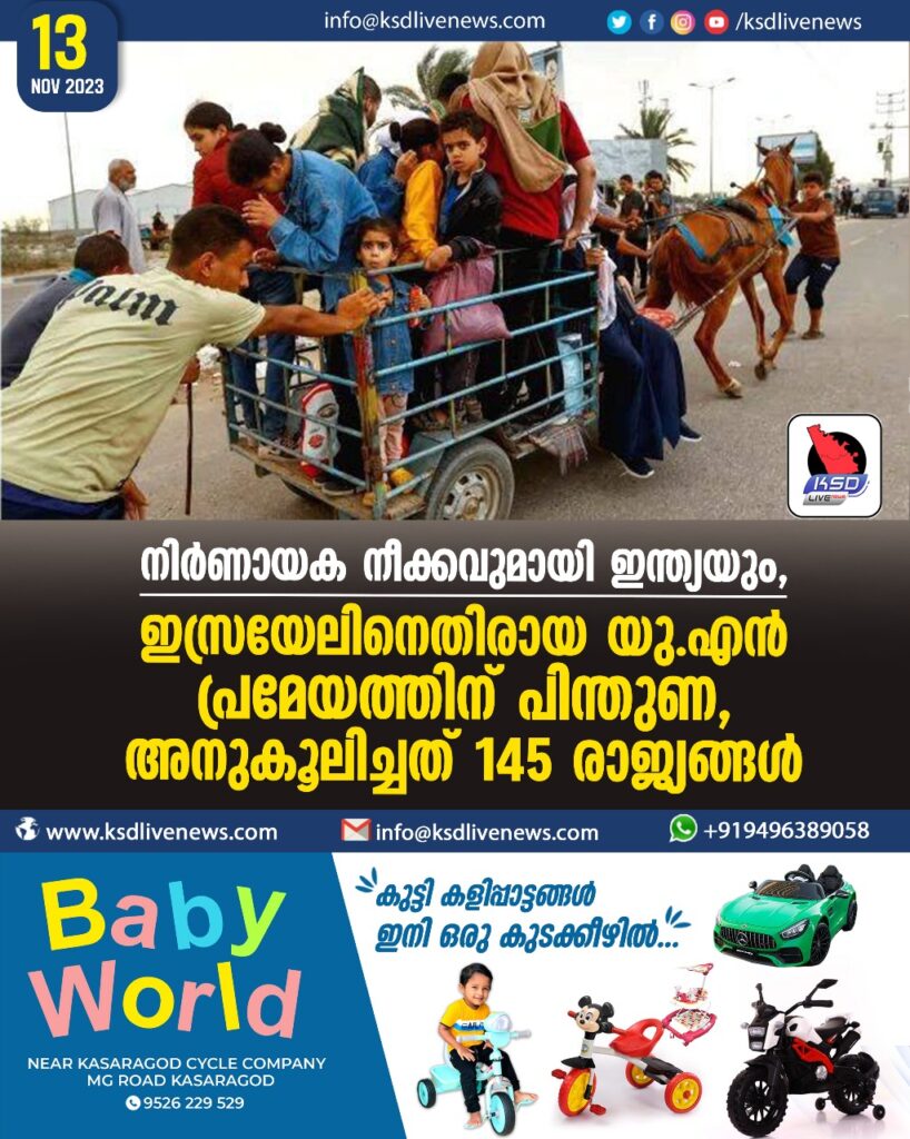 നിര്ണായക നീക്കവുമായി ഇന്ത്യയും, ഇസ്രയേലിനെതിരായ യു എൻ പ്രമേയത്തിന് പിന്തുണ, അനുകൂലിച്ചത് 145 രാജ്യങ്ങള്