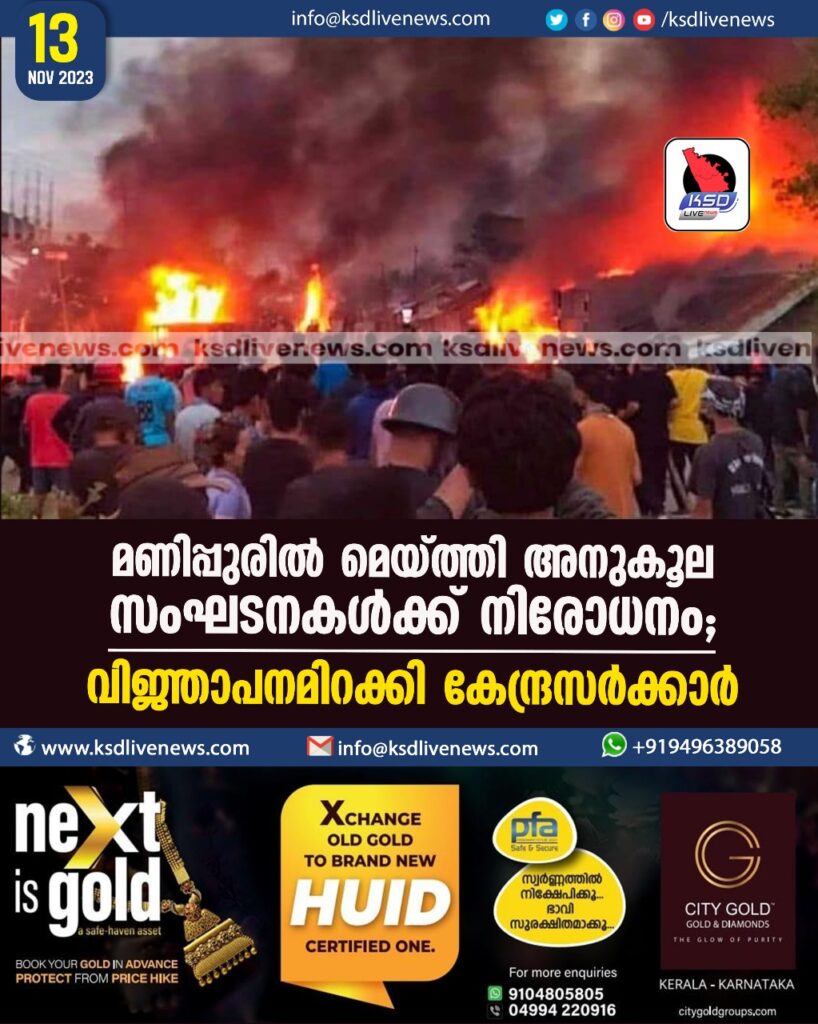 മണിപ്പുരില് മെയ്ത്തി അനുകൂലസംഘടനകള്ക്ക് നിരോധനം; വിജ്ഞാപനമിറക്കി കേന്ദ്രസര്ക്കാര്
