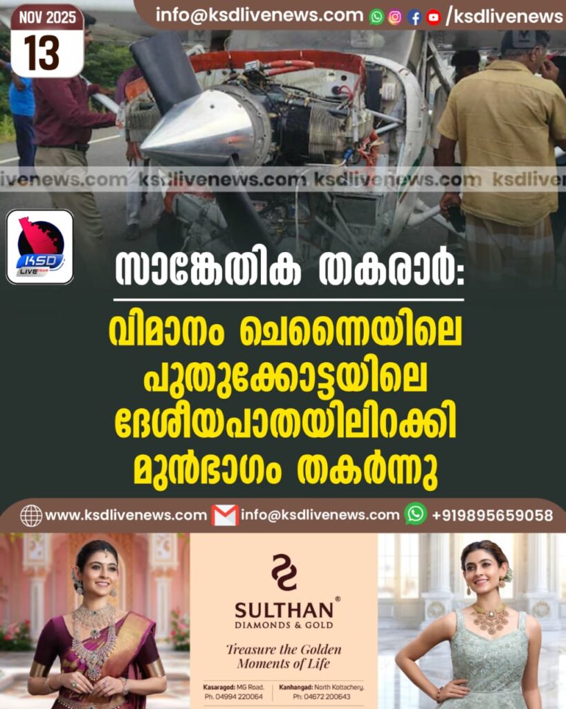 സാങ്കേതിക തകരാർ: വിമാനം ചെന്നൈയിലെ പുതുക്കോട്ടയിലെ ദേശീയപാതയിലിറക്കി മുൻഭാഗം തകർന്നു