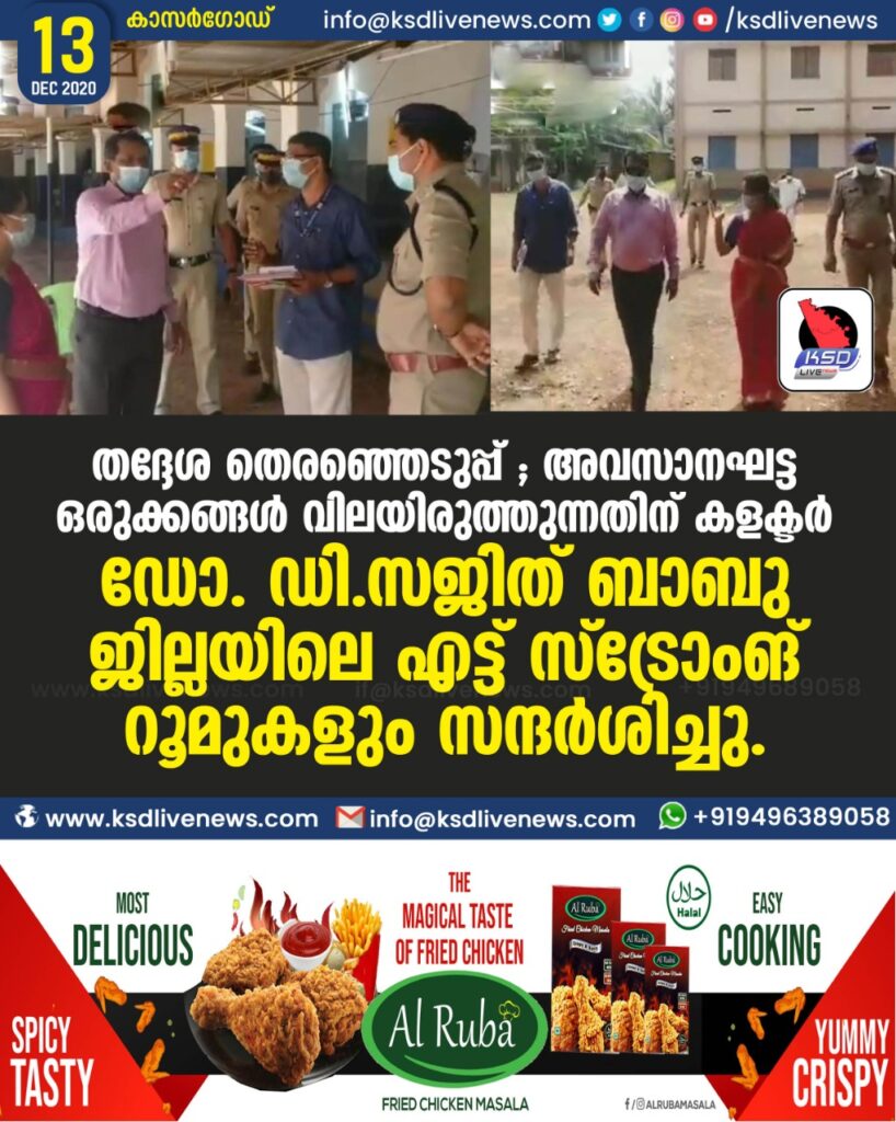 കോവിഡ് മാനദണ്ഡങ്ങൾ കർശനമായി പാലിച്ച് മാത്രം തിരഞ്ഞെടുപ്പ് സാമഗ്രികൾ വിതരണം ചെയ്യാൻ വരണാധികാരികൾക്ക് നിർദേശം നൽകി. കാസർകോട് ബ്ലോക്ക് പഞ്ചായത്ത് വരണാധികാരി കാസർകോട് ആർ.ഡി.ഒ., വി.ജെ.ഷംസുദീൻ കാസർകോട് നഗരസഭാ വരണാധികാരികളായ ഡി.ഇ.ഒ. നന്ദികേശൻ, ജില്ലാ വ്യവസായകേന്ദ്രം മാനേജർ സജിത് കുമാർ എന്നിവർ കാസർകോട് ഗവ. കോളേജിലെ സ്ട്രോങ് റൂമുകൾ സജ്ജീകരിക്കുന്നതിന് നേതൃത്വം നൽകി.