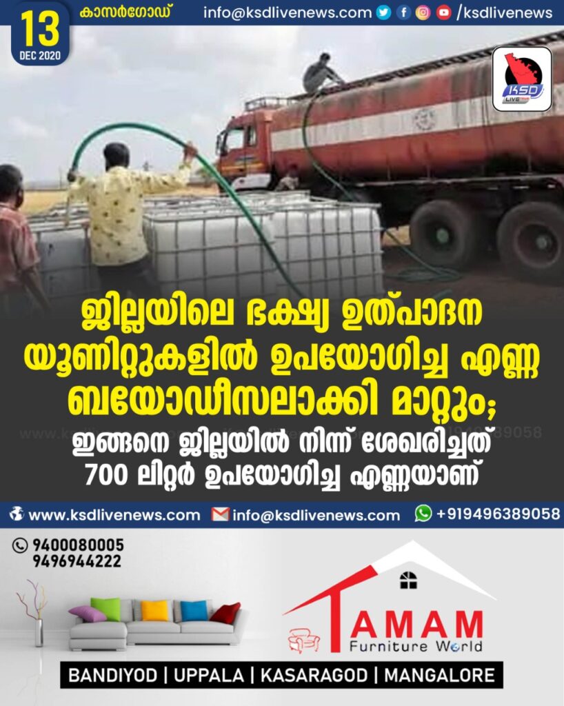 ഇങ്ങനെ ജില്ലയിൽ നിന്ന് ശേഖരിച്ചത് 700 ലിറ്റർ ഉപയോഗിച്ച എണ്ണയാണ്