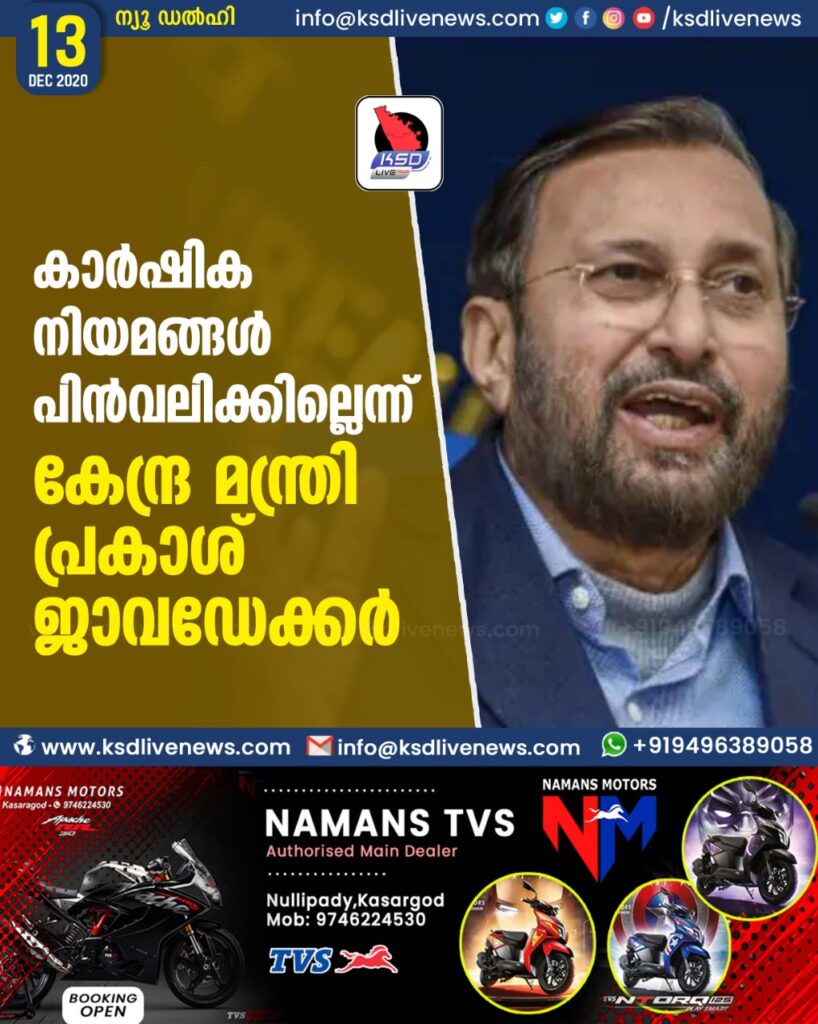 കാർഷിക നിയമങ്ങൾ പിൻവലിക്കില്ലെന്ന് കേന്ദ്ര മന്ത്രി പ്രകാശ് ജാവഡേക്കർ