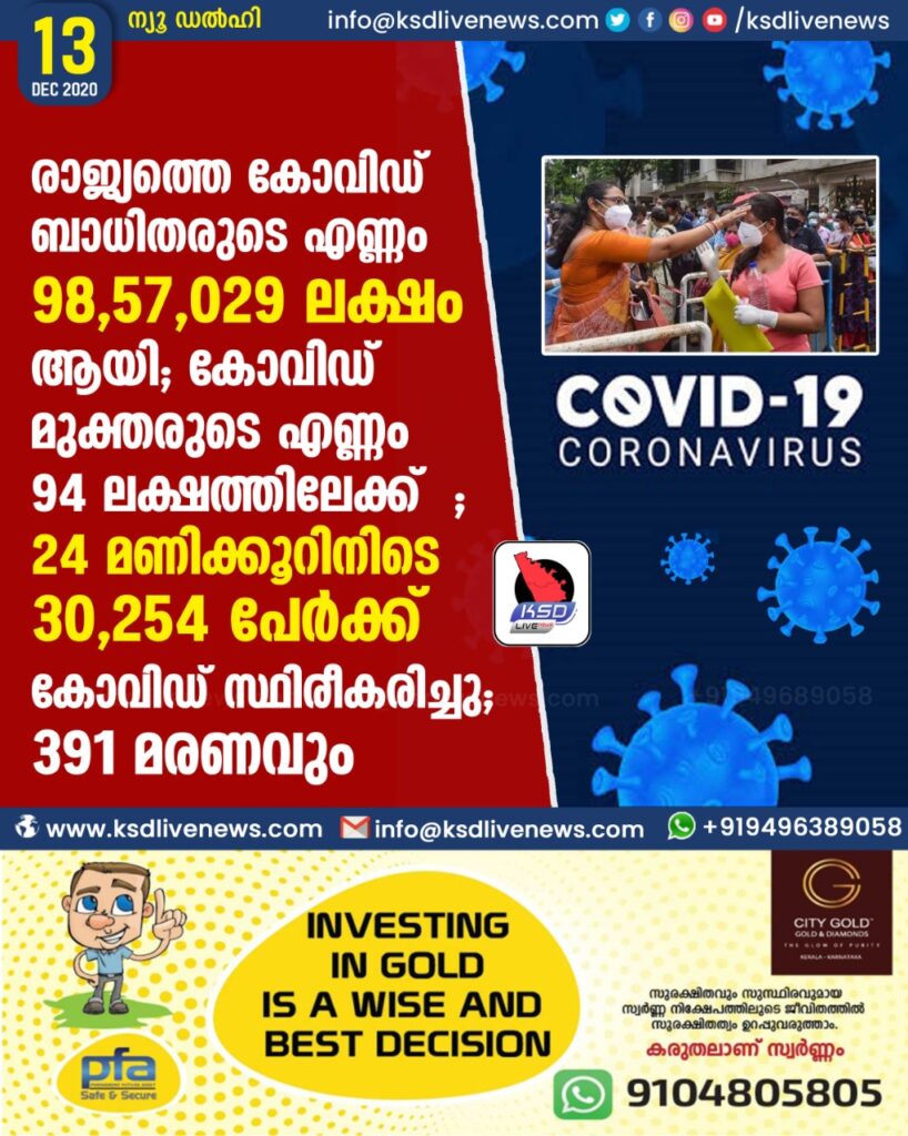 രാജ്യത്തെ കോവിഡ് ബാധിതരുടെ എണ്ണം 98,57,029 ലക്ഷം ആയി ; കോവിഡ് മുക്തരുടെ എണ്ണം 94 ലക്ഷത്തിലേക്ക് ;