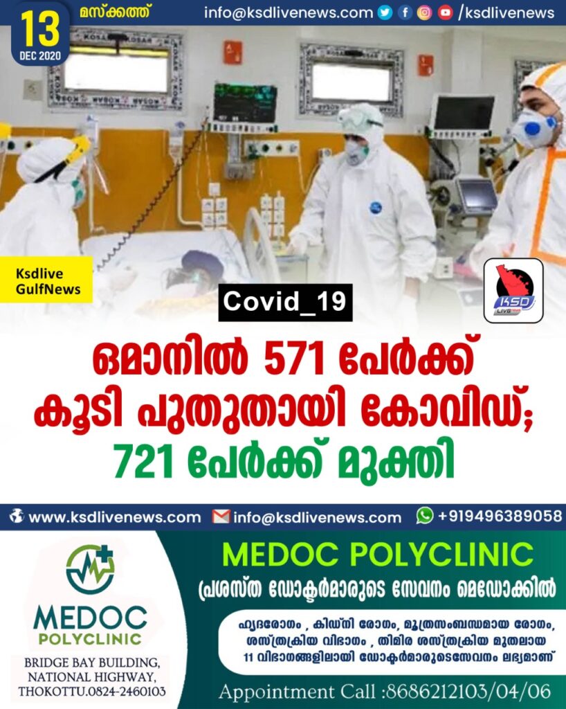 ഒമാനില് 571 പേര്ക്ക് കൂടി പുതുതായി കോവിഡ് ; 721 പേര്ക്ക് മുക്തി