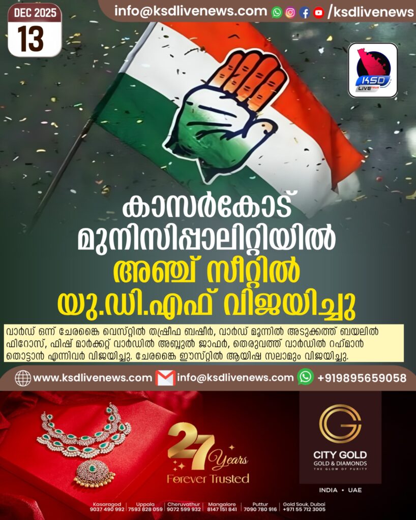 കാസർകോട് മുനിസിപ്പാലിറ്റിയിൽ അഞ്ച് സീറ്റിൽ യുഡിഎഫ് വിജയിച്ചു
