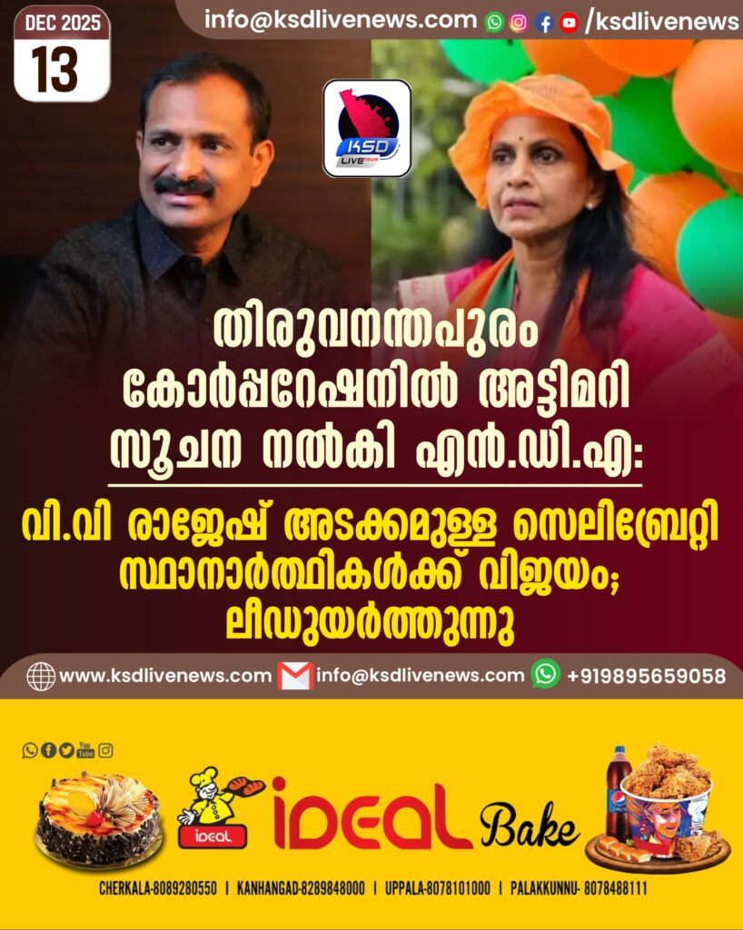 തിരുവനന്തപുരം കോര്പ്പറേഷനില് അട്ടിമറി സൂചന നല്കി എൻ.ഡി.എ: വി.വി രാജേഷ് അടക്കമുള്ള സെലിബ്രേറ്റി സ്ഥാനാര്ത്ഥികള്ക്ക് വിജയം; ലീഡുയര്ത്തുന്നു