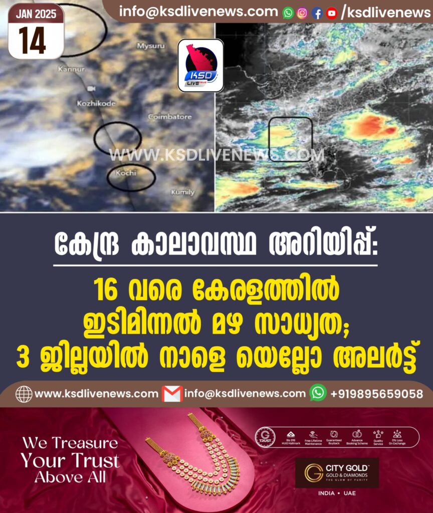 കേന്ദ്ര കാലാവസ്ഥ അറിയിപ്പ്, 16 വരെ കേരളത്തില് ഇടിമിന്നല് മഴ സാധ്യത; 3 ജില്ലയില് നാളെ യെല്ലോ അലര്ട്ട്