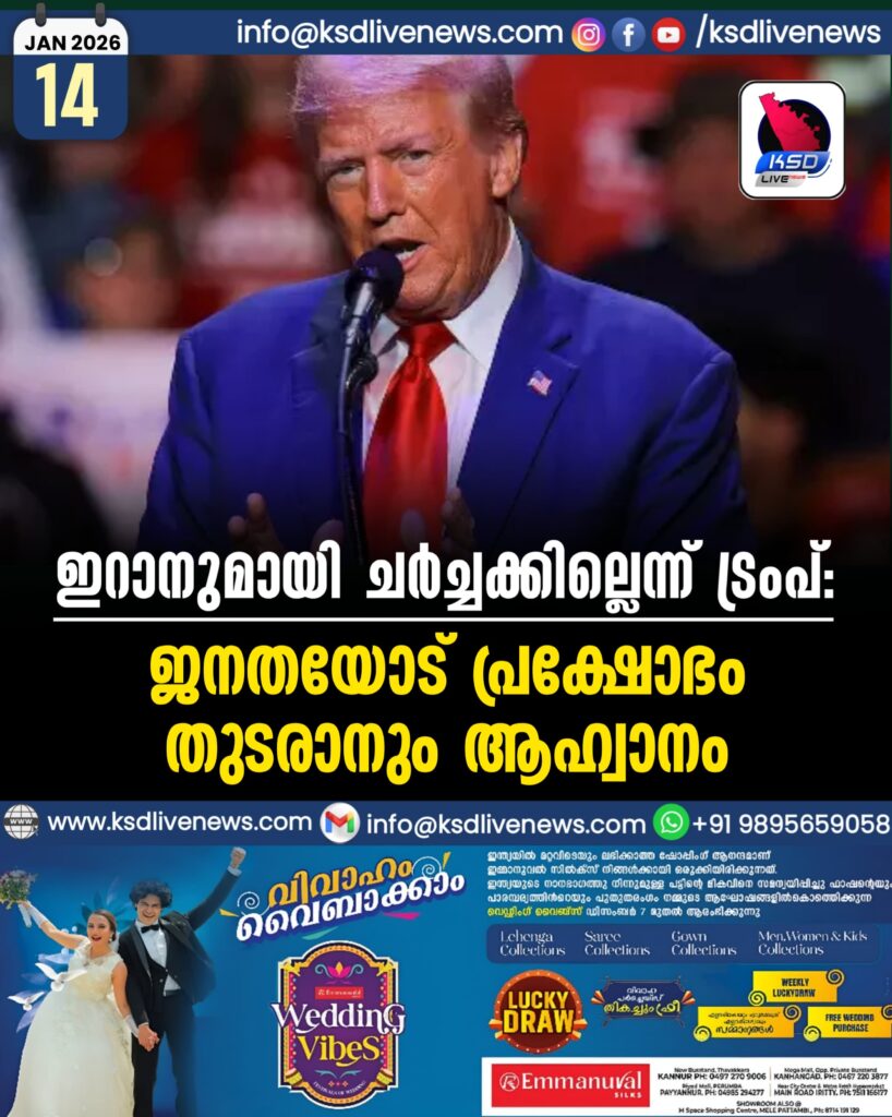 ഇറാനുമായി ചർച്ചക്കില്ലെന്ന് ട്രംപ്: ജനതയോട് പ്രക്ഷോഭം തുടരാനും ആഹ്വാനം