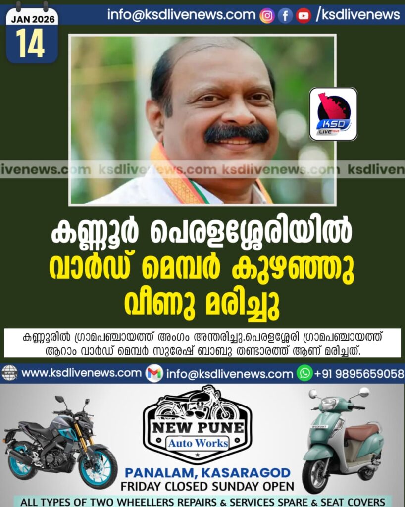 കണ്ണൂര്‍: കണ്ണൂരില്‍ ഗ്രാമപഞ്ചായത്ത് അംഗം അന്തരിച്ചു.പെരളശ്ശേരി ഗ്രാമപഞ്ചായത്ത് ആറാം വാർഡ് മെമ്പര്‍ സുരേഷ് ബാബു തണ്ടാരത്ത് ആണ് മരിച്ചത്.
