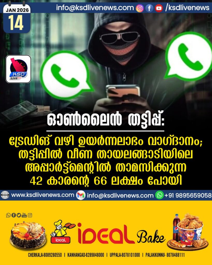 ഓൺലൈൻ തട്ടിപ്പ്;ട്രേഡിങ് വഴി ഉയർന്നലാഭം വാഗ്ദാനം; തട്ടിപ്പിൽ വീണ തായലങ്ങാടിയിലെ അപ്പാർട്ട്മെന്റിൽ താമസിക്കുന്ന 42 കാരന്റെ 66 ലക്ഷം പോയി