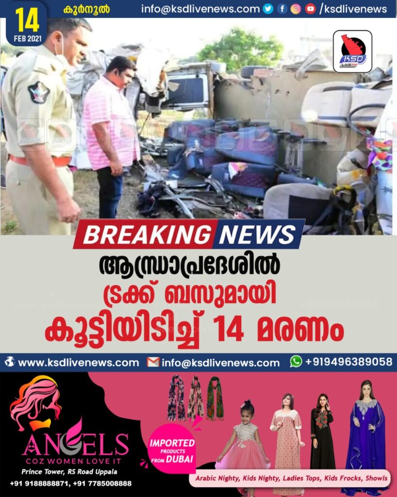 കുർനൂൽ:ട്രക്കും ബസുമായി കൂട്ടിയിടിച്ച് ആന്ധ്രാപ്രദേശിൽ ഒരു കുട്ടിയുൾപ്പെടെ 14 പേർ മരിച്ചു. ഞായറാഴ്ച രാവിലെ കുർനൂൽ ജില്ലയിലെ മദർപുർ ഗ്രാമത്തിലെ ദേശീയപാതയിലാണ് അപകടം ഉണ്ടായത്.