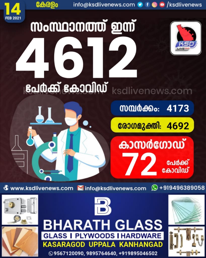 സംസ്ഥാനത്ത് ഇന്ന് 4612 പേർക്ക് കോവിഡ് സ്ഥിരീകരിച്ചു. സമ്പർക്കം വഴി 4173 പേർക്കും ; ആശ്വാസമായി 4692 പേർക്ക് രോഗ മുക്തിയും ; കാസർഗോഡ് ജില്ലയിൽ 72 പേർക്ക് പുതിയ കോവിഡ് കേസുകൾ ; മരണം 15