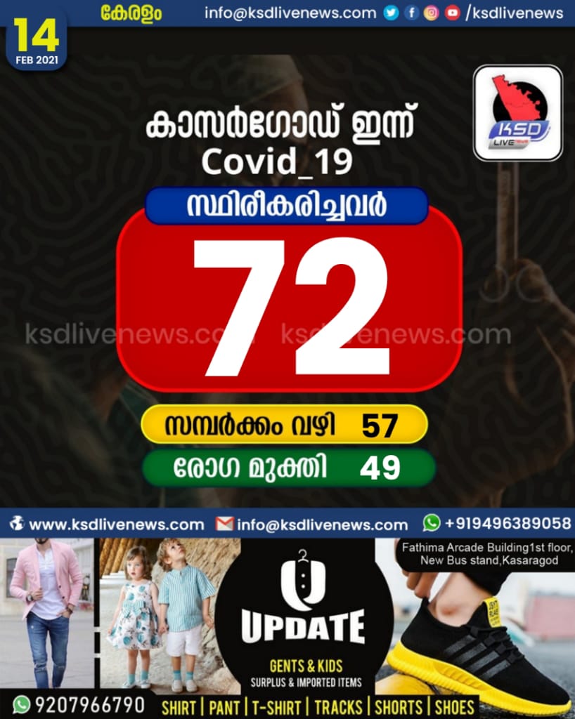 കാസർഗോഡ് ജില്ലയിൽ ഇന്ന് 72 പേർക്ക് കോവിഡ് സ്ഥിരീകരിച്ചു. സമ്പർക്കം വഴി 57 പേർക്കും. 49 പേർക്ക് രോഗമുക്തി