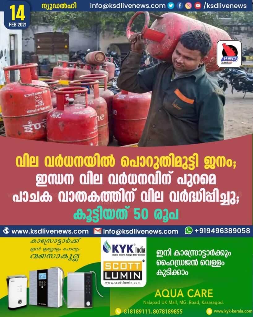 വില വർധനയിൽ പൊറുതിമുട്ടി ജനം;ഇന്ധന വില വർധനവിന് പുറമെ പാചക വാതകത്തിന് വില വർദ്ധിപ്പിച്ചു; കൂട്ടിയത് 50 രൂപSHARE THIS ONന്യൂഡല്ഹി: പെട്രോള്, ഡീസല് വിലവര്ധന തുടരുന്നതിനിടെ പാചക വാതക വിലയും ഉയരുന്നു. ഗാര്ഹിക ഉപഭോക്താക്കള്ക്കുള്ള എല്പിജി സിലിണ്ടറിന് (14.2 കിലോ) 50 …