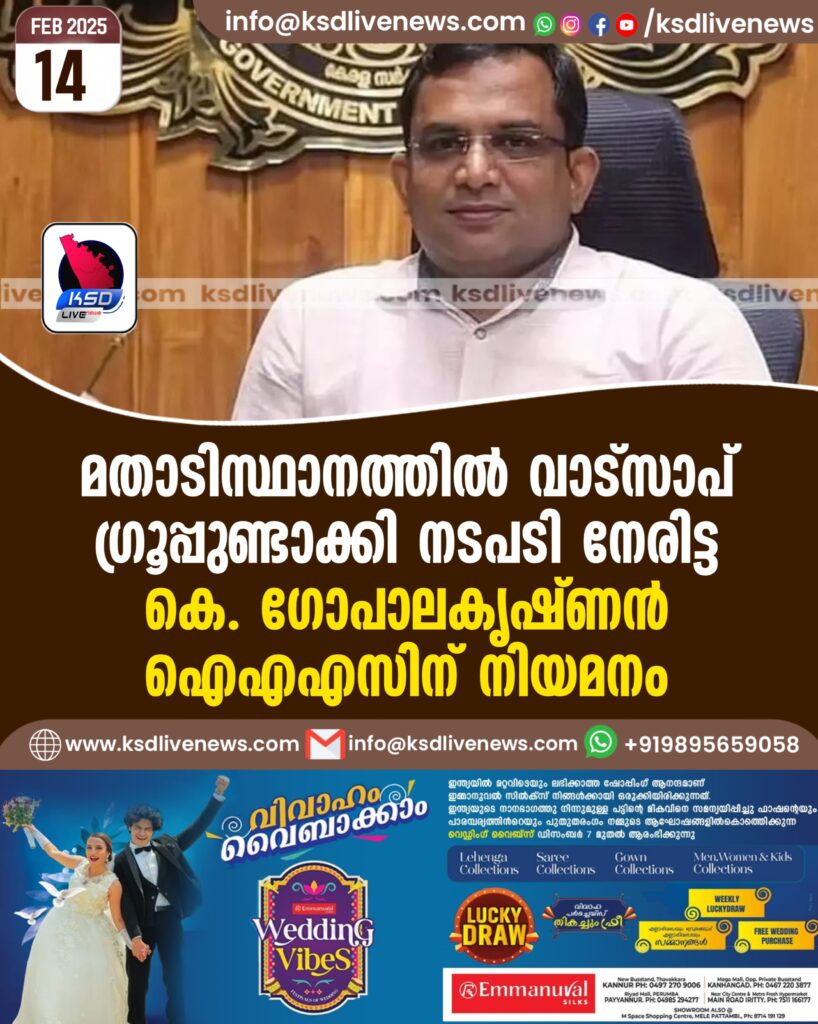 മതാടിസ്ഥാനത്തില് വാട്സാപ് ഗ്രൂപ്പുണ്ടാക്കി നടപടി നേരിട്ട കെ.ഗോപാലകൃഷ്ണൻ ഐഎഎസിന് നിയമനം