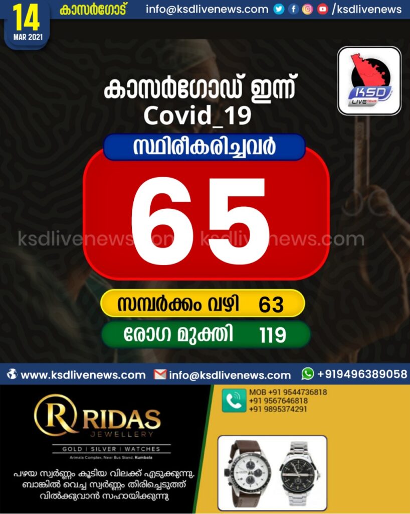 കാസർഗോഡ് ജില്ലയിൽ ഇന്ന് 65 പേർക്ക് കോവിഡ് സ്ഥിരീകരിച്ചു. സമ്പർക്കം വഴി 63 പേർക്കും. 119 പേർക്ക് രോഗമുക്തി