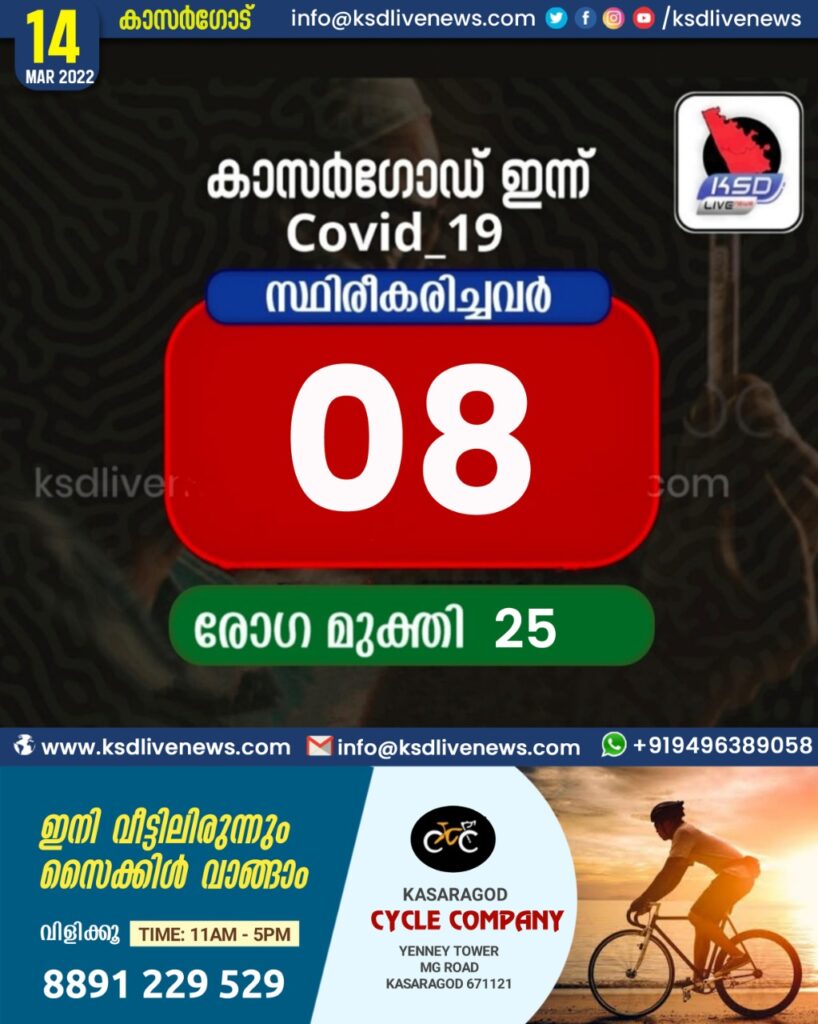 കാസർഗോഡ് ജില്ലയിൽ ഇന്ന് 08 പേർക്ക് കോവിഡ് സ്ഥിരീകരിച്ചു. 25 പേർക്ക് രോഗമുക്തി
