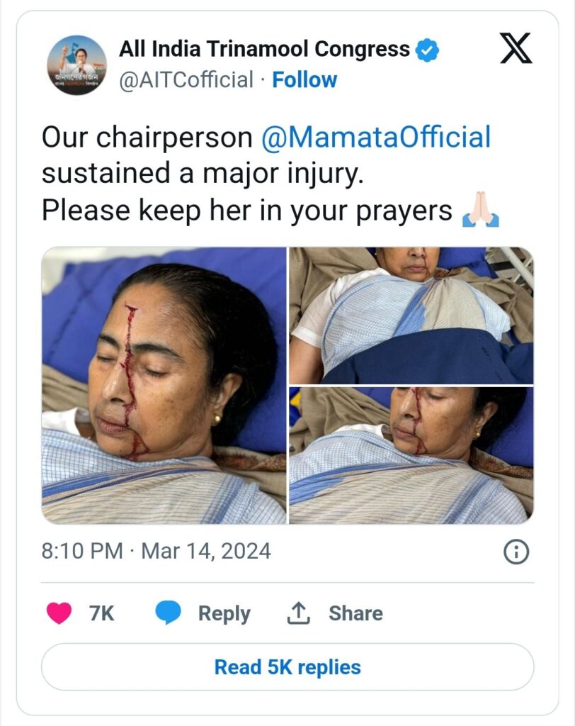 ന്യൂഡല്‍ഹി: പശ്ചിമബംഗാള്‍ മുഖ്യമന്ത്രി മമത ബാനര്‍ജി നെറ്റിയില്‍ ഗുരുതരപരിക്കേറ്റ് ചികിത്സയിൽ. തൃണമൂല്‍ കോണ്‍ഗ്രസ് ഔദ്യോഗിക എക്‌സ് ഹാന്‍ഡിലിലാണ് ഇക്കാര്യം അറിയിച്ചത്. മമതയ്ക്ക് ഗുരുതരമായി പരിക്കേറ്റുവെന്നും പ്രാര്‍ഥനകളില്‍ ഉള്‍പ്പെടുത്തണമെന്നും ഫോട്ടോയ്‌ക്കൊപ്പമുള്ള കുറിപ്പില്‍ പറയുന്നു.