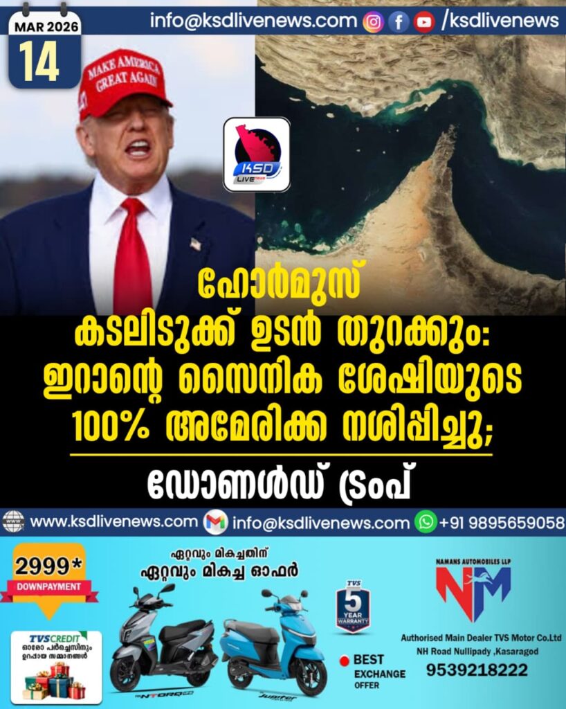 ഹോർമുസ് കടലിടുക്ക് ഉടൻ തുറക്കും: ഇറാന്റെ സൈനിക ശേഷിയുടെ 100% അമേരിക്ക നശിപ്പിച്ചു; ഡോണൾഡ് ട്രംപ്