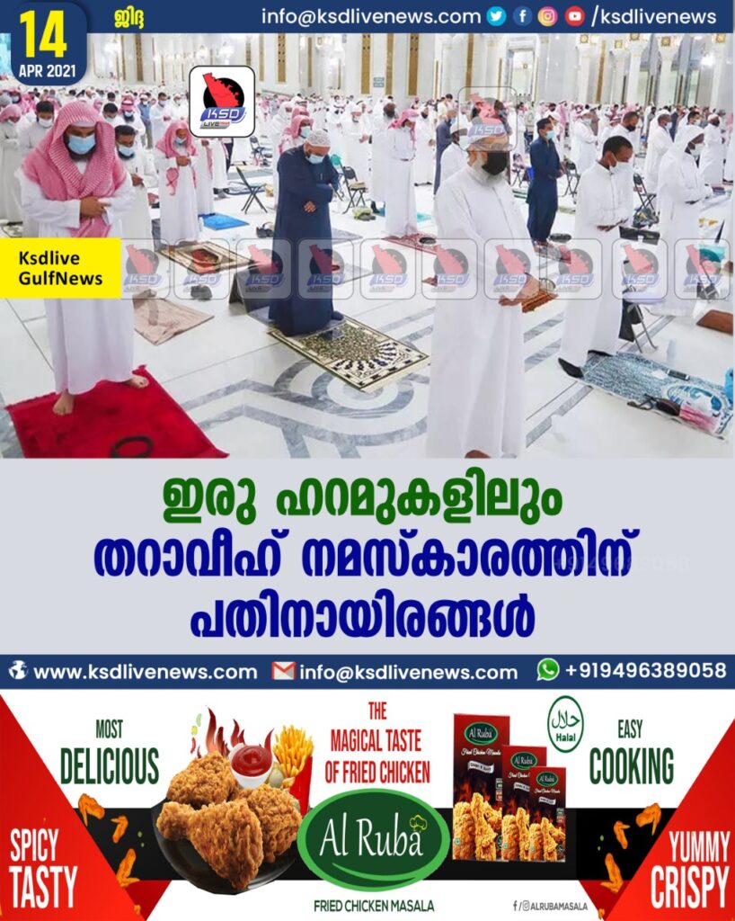 മ​സ്ജി​ദു​ൽ ഹ​റാ​മി​ലെ ത​റാ​വീ​ഹ് ന​മ​സ്കാ​ര​ത്തി​ന് ഇ​രു​ഹ​റം കാ​ര്യാ​ല​യ മേ​ധാ​വി ഡോ. ​അ​ബ്​​ദു​റ​ഹ്മാ​ൻ അ​ൽ​സു​ദൈ​സ് നേ​തൃ​ത്വം ന​ൽ​കി. ഇ​ശാ ന​മ​സ്കാ​ര​ശേ​ഷം ന​ട​ത്തി​യ പ്ര​സം​ഗ​ത്തി​ൽ കോ​വി​ഡ് വ്യാ​പ​നം ത​ട​യാ​ൻ മാ​സ്ക് ധ​രി​ക്കു​ക, സാ​മൂ​ഹി​ക അ​ക​ലം പാ​ലി​ക്കു​ക തു​ട​ങ്ങി​യ മു​ൻ​ക​രു​ത​ൽ ന​ട​പ​ടി​ക​ൾ പാ​ലി​ക്കേ​ണ്ട​തി​‍െൻറ പ്ര​ധാ​ന്യം തീ​ർ​ഥാ​ട​ക​രെ​യും ന​മ​സ്ക​രി​ക്കാ​നെ​ത്തി​യ​വ​രെ​യും ഇ​രു​ഹ​റം കാ​ര്യാ​ല​യ മേ​ധാ​വി ഉ​ണ​ർ​ത്തി.
