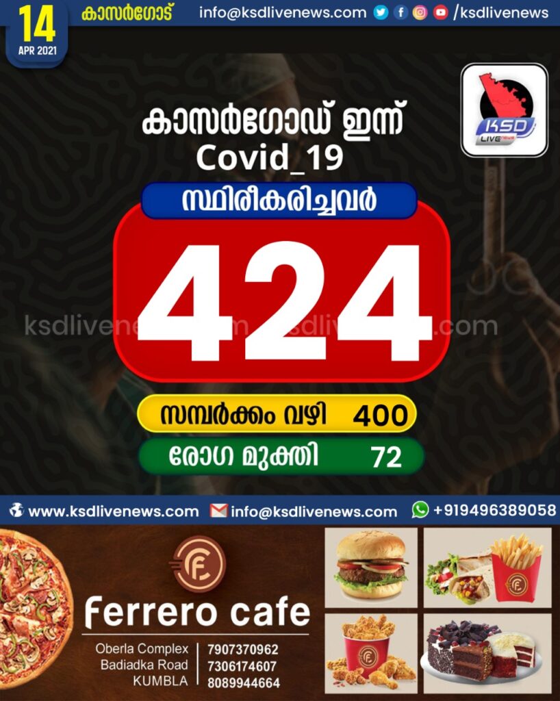 കാസർഗോഡ് ജില്ലയിൽ ഇന്ന് 424 പേർക്ക് കോവിഡ് സ്ഥിരീകരിച്ചു. സമ്പർക്കം വഴി 400 പേർക്കും. 72 പേർക്ക് രോഗമുക്തിSHARE THIS ONകാസർഗോഡ് ജില്ലയിൽ ഇന്ന് 424 പേർക്ക് കോവിഡ് സ്ഥിരീകരിച്ചു. സമ്പർക്കം വഴി 400 പേർക്കും. 72 പേർക്ക് രോഗമുക്തി