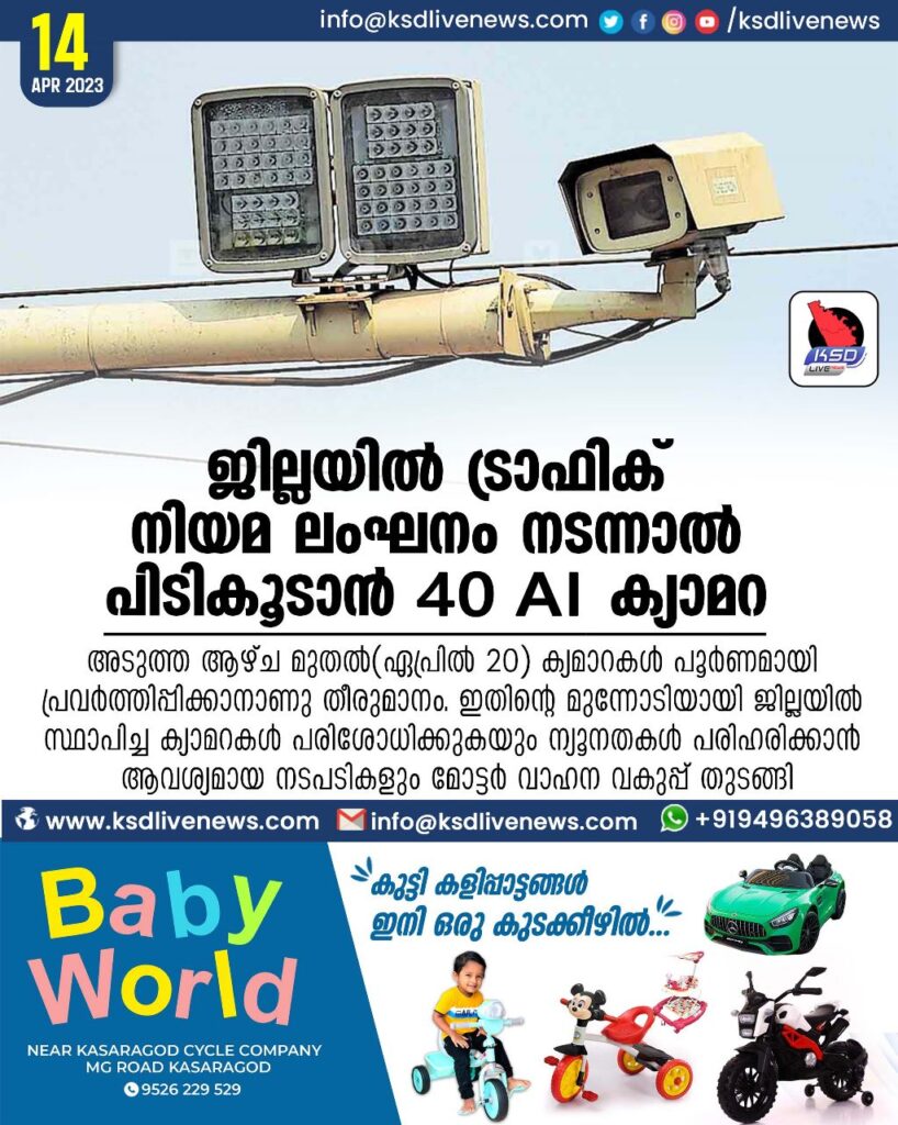 ജില്ലയിൽ ട്രാഫിക് നിയമ ലംഘനം നടന്നാൽ പിടികൂടാൻ 40 AI ക്യാമറ