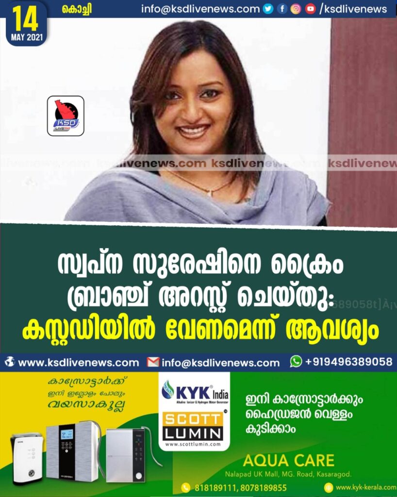 സ്വപ്ന സുരേഷിനെ ക്രൈം ബ്രാഞ്ച് അറസ്റ്റ് ചെയ്തു: കസ്റ്റഡിയിൽ വേണമെന്ന് ആവശ്യം