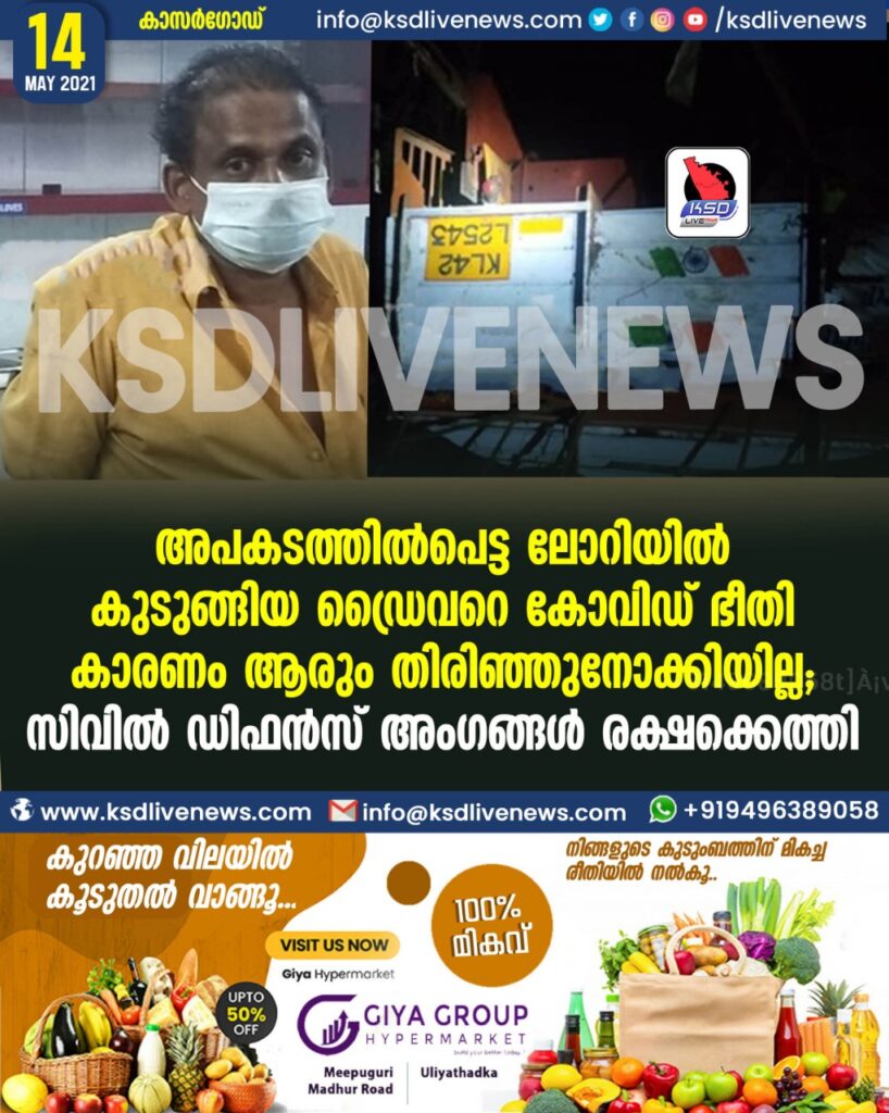 കാഞ്ഞങ്ങാട്: നിയന്ത്രണം വിട്ട് മറിഞ്ഞ ലോറിയില്‍ കുടുങ്ങി നിലവിളിച്ച ഡ്രൈവറെ കോവിഡ് ഭയന്ന് ആരും തിരിഞ്ഞു നോക്കിയില്ല. ആരും തിരിഞ്ഞു നോക്കാത്ത ഡ്രൈവര്‍ക്ക് തുണയായി സിവില്‍ ഡിഫന്‍സ് ടീമംഗങ്ങള്‍. ഇന്നലെ രാത്രി പത്തരയോടെ ദേശീയപാതയില്‍ പൊള്ളക്കടയിലാണ് അപകടം.