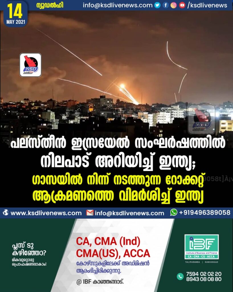 പലസ്തീന് – ഇസ്രയേല് സംഘര്ഷത്തില് നിലപാട് അറിയിച്ച് ഇന്ത്യ; ഗാസയിൽ നിന്ന് നടത്തുന്ന റോക്കറ്റ് ആക്രമണത്തെ വിമർശിച്ച് ഇന്ത്യ