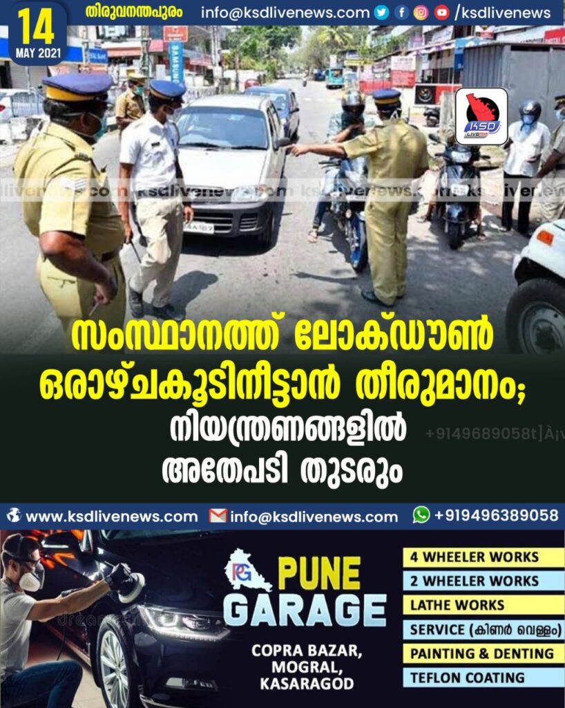 സംസ്ഥാനത്ത് ലോക്ഡൗണ്‍ ഒരാഴ്ചകൂടി നീട്ടാന്‍ തീരുമാനം; നിയന്ത്രണങ്ങളിൽ അതേപടി തുടരും