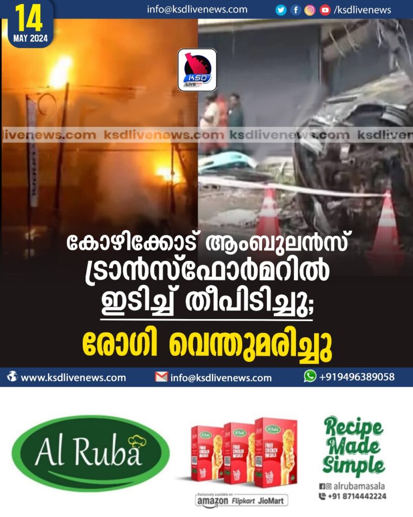 കോഴിക്കോട് ആംബുലൻസ് ട്രാൻസ്ഫോർമറിൽ ഇടിച്ച് തീപിടിച്ചു; രോഗി വെന്തുമരിച്ചു