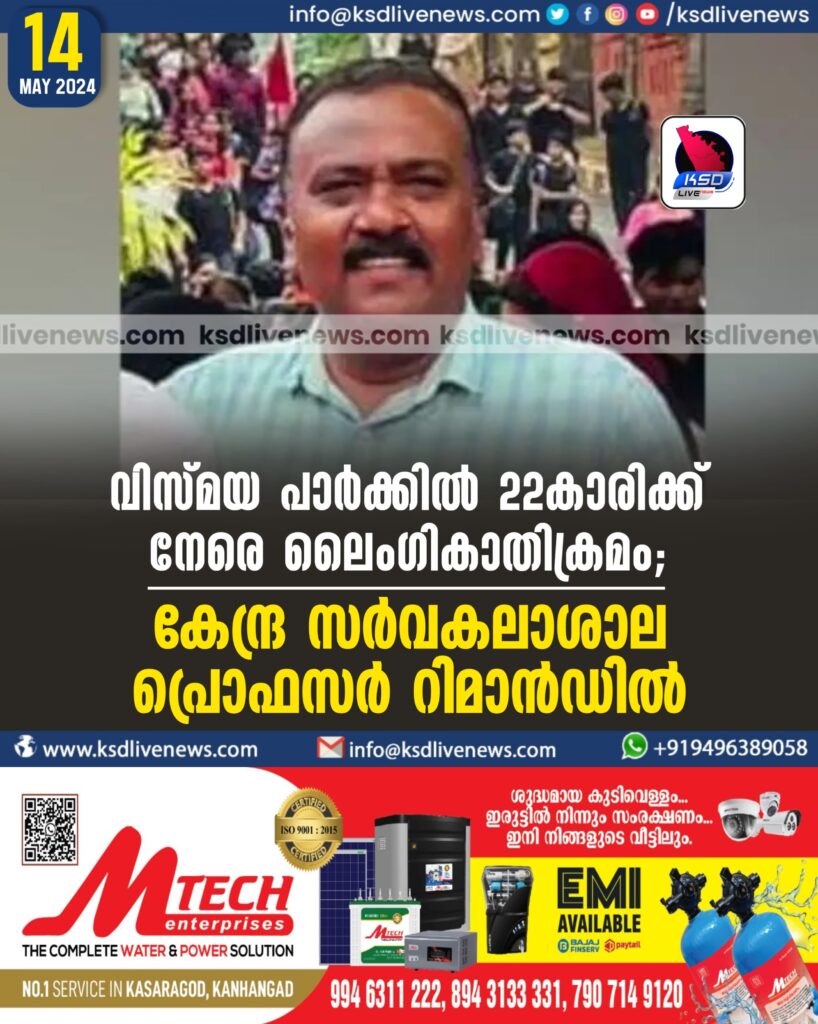 വിസ്മയ പാര്ക്കില് 22കാരിക്ക് നേരെ ലൈംഗികാതിക്രമം; കേന്ദ്ര സര്വകലാശാല പ്രൊഫസര് റിമാൻഡില്