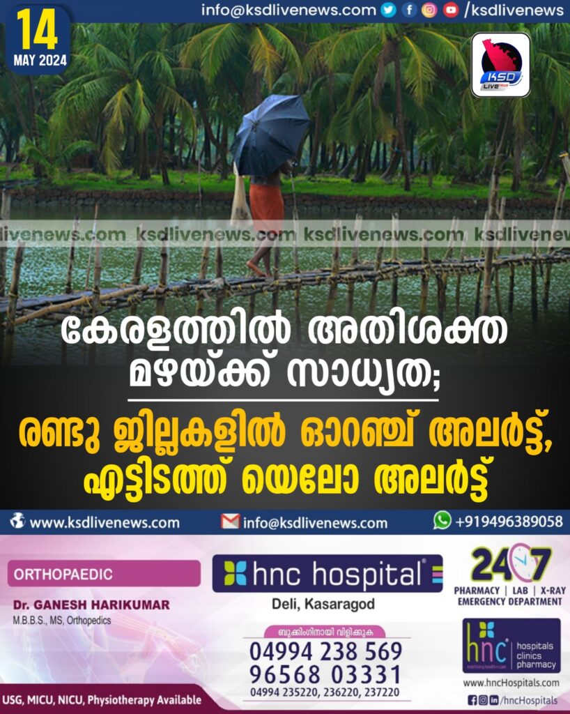 കേരളത്തിൽ അതിശക്ത മഴയ്ക്ക് സാധ്യത; രണ്ടു ജില്ലകളിൽ ഓറഞ്ച് അലർട്ട്, എട്ടിടത്ത് യെലോ അലർട്ട്