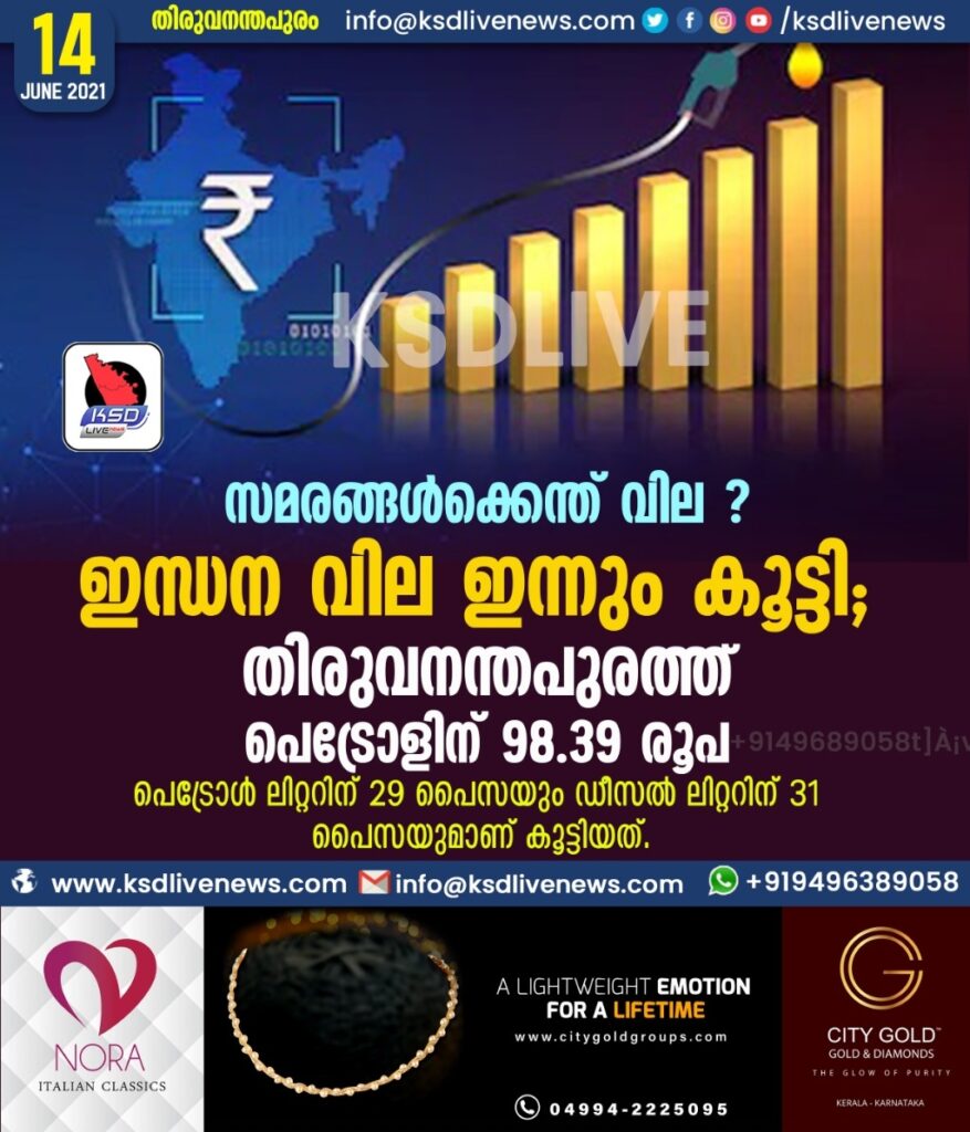 ഇന്ധന വില ഇന്നും കൂട്ടി; തിരുവനന്തപുരത്ത് പെട്രോളിന് 98.39 രൂപ