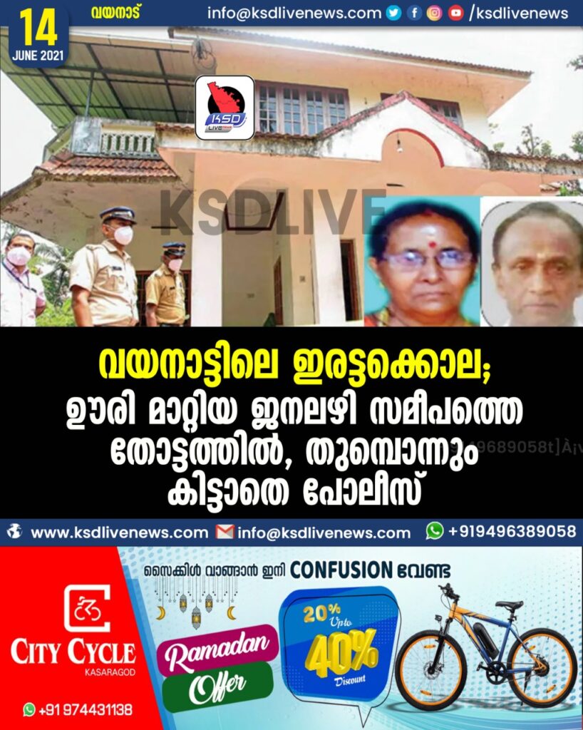 വയനാട്ടിലെ ഇരട്ടക്കൊല: ഊരി മാറ്റിയ ജനലഴി സമീപത്തെ തോട്ടത്തില്, തുമ്പൊന്നും കിട്ടാതെ പോലീസ്