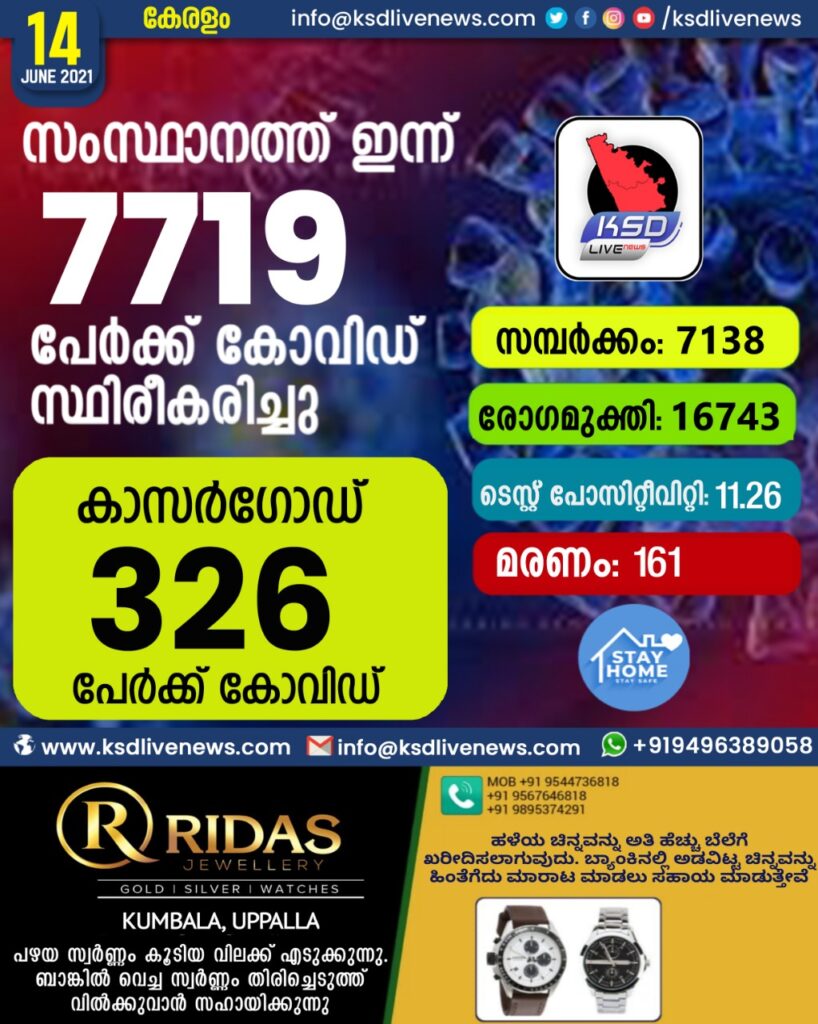 ആശ്വാസം ; കേരളത്തിൽ കോവിഡ് കുറയുന്നു; സംസ്ഥാനത്ത് ഇന്ന് 7719 പേർക്ക് കോവിഡ് സ്ഥിരീകരിച്ചു. സമ്പർക്കം വഴി 7138 പേർക്കും ; ആശ്വാസമായി 16743 പേർക്ക് രോഗ മുക്തിയും ; കാസർഗോഡ് ജില്ലയിൽ 326 പേർക്ക് പുതിയ കോവിഡ് കേസുകൾ ; മരണം 161