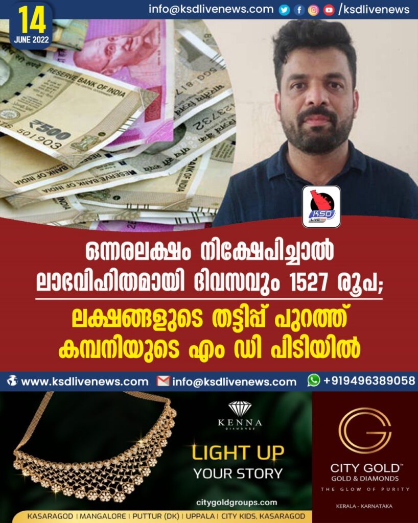 ഒന്നരലക്ഷം നിക്ഷേപിച്ചാല് ലാഭവിഹിതമായി ദിവസവും 1527 രൂപ, ലക്ഷങ്ങളുടെ തട്ടിപ്പ് പുറത്ത്, കമ്പനിയുടെ എം ഡി പിടിയില്