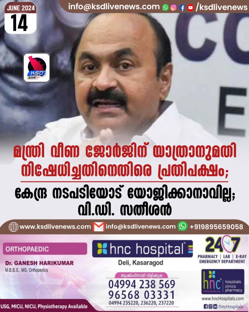 മന്ത്രി വീണ ജോര്ജിന് യാത്രാനുമതി നിഷേധിച്ചതിനെതിരെ പ്രതിപക്ഷം; കേന്ദ്ര നടപടിയോട് യോജിക്കാനാവില്ല -വി.ഡി. സതീശൻ