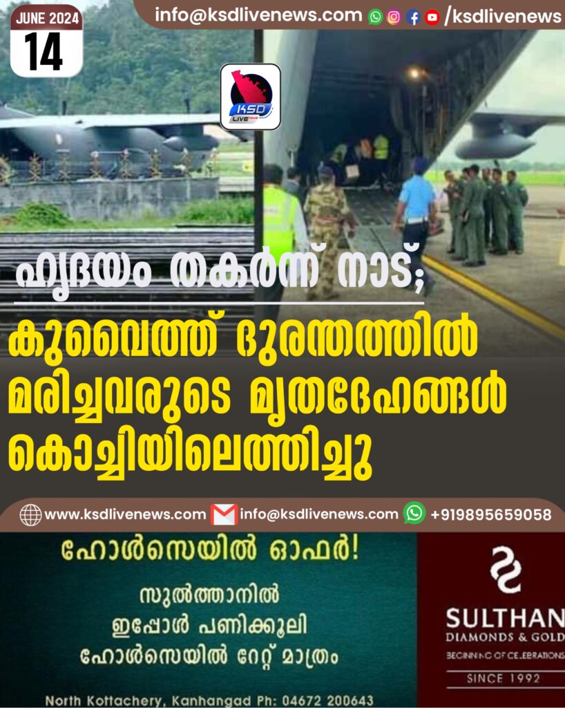 ഹൃദയം തകര്ന്ന് നാട്; കുവൈത്ത് ദുരന്തത്തിൽ മരിച്ചവരുടെ മൃതദേഹങ്ങള് കൊച്ചിയിലെത്തിച്ചു