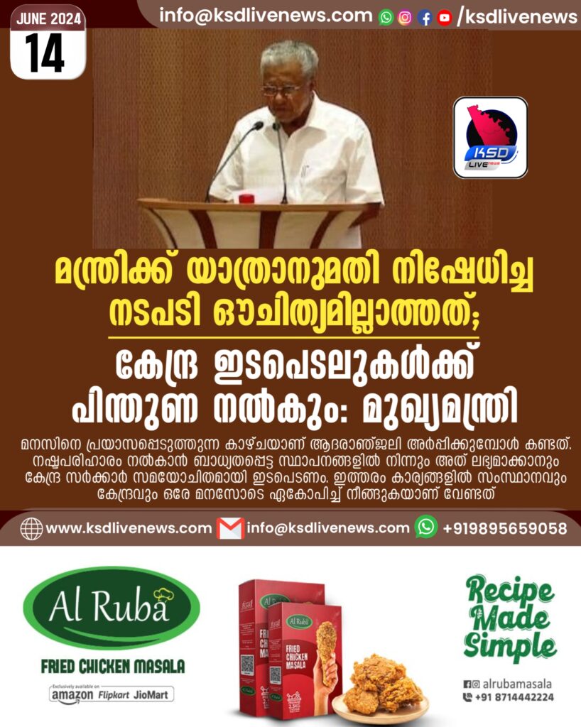 മന്ത്രിക്ക് യാത്രാനുമതി നിഷേധിച്ച നടപടി ഔചിത്യമില്ലാത്തത്, കേന്ദ്ര ഇടപെടലുകൾക്ക് പിന്തുണ നൽകും: മുഖ്യമന്ത്രി