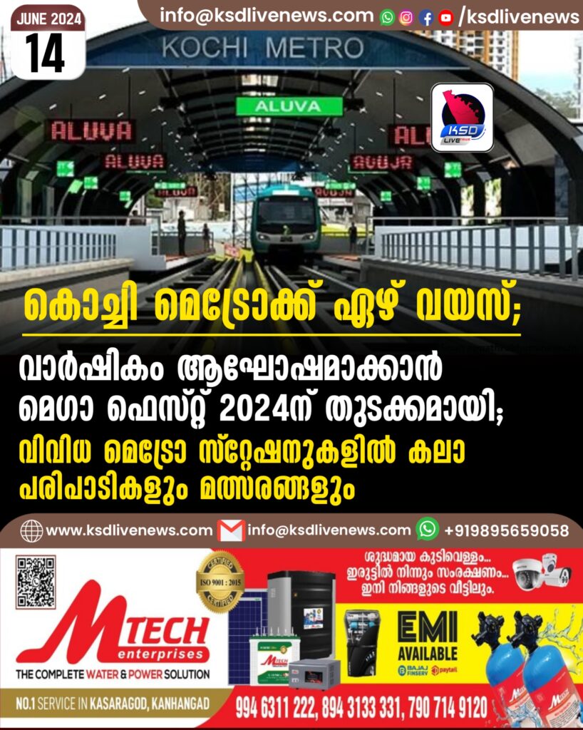 കൊച്ചി മെട്രോക്ക് ഏഴ് വയസ്; വാര്ഷികം ആഘോഷമാക്കാൻ മെഗാ ഫെസ്റ്റ് 2024 ന് തുടക്കമായി; വിവിധ മെട്രോ സ്റ്റേഷനുകളിൽ കലാ പരിപാടികളും മത്സരങ്ങളും