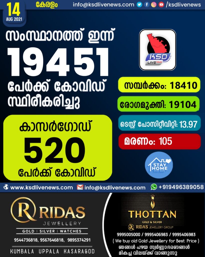 കോവിഡിൽ വിറച്ച് കേരളം ; സംസ്ഥാനത്ത് ഇന്ന് 19451 പേർക്ക് കോവിഡ് സ്ഥിരീകരിച്ചു. സമ്പർക്കം വഴി 18410 പേർക്കും ; ആശ്വാസമായി 19104 പേർക്ക് രോഗ മുക്തിയും ; കാസർഗോഡ് ജില്ലയിൽ 520 പേർക്ക് പുതിയ കോവിഡ് കേസുകൾ ; മരണം 105