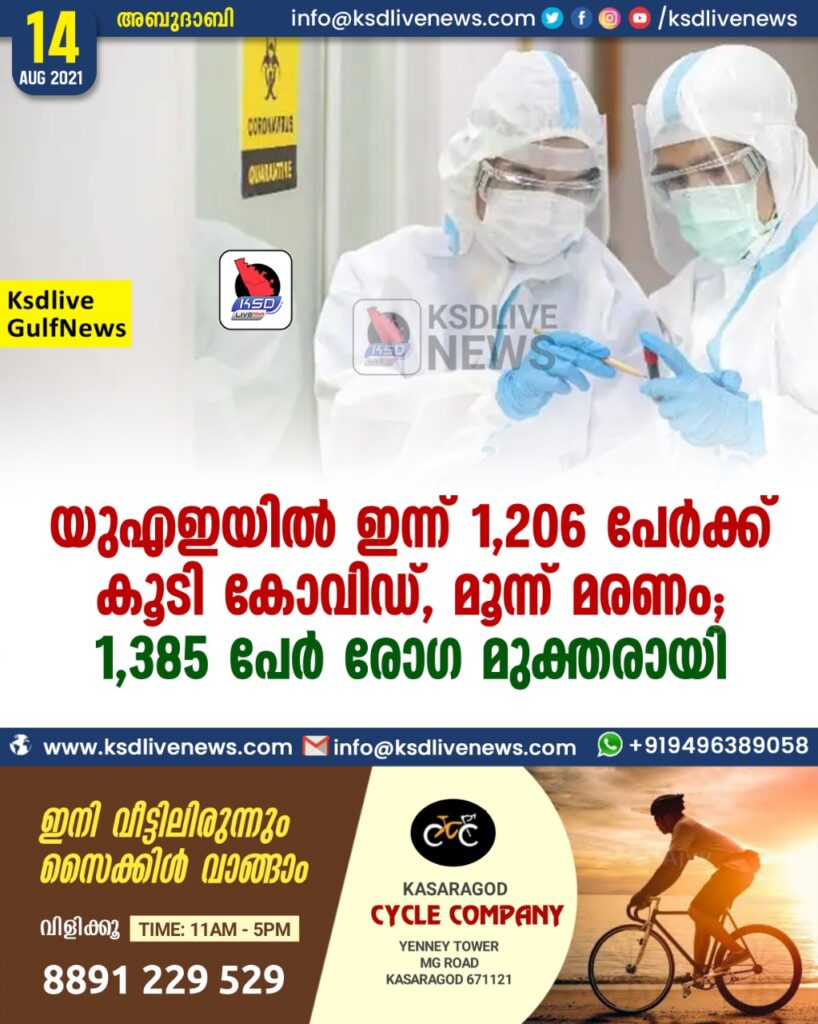 യുഎഇയില് ഇന്ന് 1,206 പേര്ക്ക് കൂടി കോവിഡ്, മൂന്ന് മരണം; 1,385 പേർ രോഗ മുക്തരായി