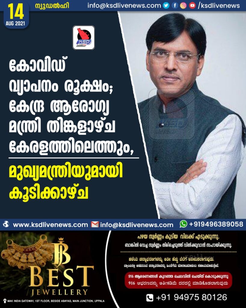 കോവിഡ് വ്യാപനം രൂക്ഷം; കേന്ദ്ര ആരോഗ്യ മന്ത്രി തിങ്കളാഴ്ച കേരളത്തിലെത്തും, മുഖ്യമന്ത്രിയുമായി കൂടിക്കാഴ്ച